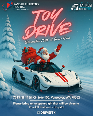 Bring a new, unwrapped toy to donate and help bring smiles to kids spending the holidays in the hospital. We'll have an incredible lineup of cars, festive energy, and warm coffee and refreshments to stay warm. More details to come soon-including drop-off locations, special guests, and surprises that you won't want to miss.