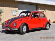 $32500.00 1968 Volkswagen Beetle In late 1967, this brand new 1968 Volkswagen left the showroom in San Diego with its first owner behind the wheel. The story of its professional transition to a second life follows: Bodywork: The body was separated from the floor pan and everything was removed from the body shell. After every nut, bolt, screw, doors, windows, hardware, trim, badges were removed, it was media blasted so that only the bare steel remained. No rust was found once several coats of paint were stripped. Only minor dents were found and these were hammered smooth prior to a minimal application of skim coat to create a flawless body. After that, PPG epoxy primer was applied, followed by a liberal coat of PPG heavy base primer. When the primer coats were sanded smooth, PPG sealer prepared the body for several coats of the PPG Porsche (Indian) Red urethane finish coating a majority of the body components. Then, the remainder of the Beetle received several coats of silky silver PPG Casmir urethane. Finally, the VW was coated four separate times with PPG clearcoat, each coat meticulously color sanded to a stunning high gloss finish. Before reassembly, the interior of the body was covered in DynaMat thermal and sound deadening insulation. A complete new rubber kit was installed - door and window seals, hood seal, and body to pan gaskets. The windshield was replaced along with the trim and rubber for the rest of the windows. Floor pan: The floor pan was completely disassembled of all parts removed. Like the body, the pan was media blasted to remove dirt, grime, paint and undercoating. At the point where the stock battery was located, a small area of rust was found. Rather than patch this small area, the builder replaced the floor section from the rear cross member to the seat runners. The new section was MIG welded in place and the pan was coated with epoxy primer and three coats of black semi-gloss urethane paint was applied. Prior to reassembly with the body, new front suspension parts - ball joints, tie rod ends, steering box, and disk brakes were installed. Then fresh rubber seals, new brake lines, master cylinder, and a new transaxle from Rancho Transmissions were installed. At this time, the emergency brake, clutch, heater control and throttle cables were replaced with new components. The gear selector shaft was installed with new bushings, a polyurethane coupler, and EMPI short throw shifter. The pan was completely insulated to minimize the noxious engine noise so evident in a stock VW. Electrical: The stock wiring harness was replaced with a new harness configured for an alternator rather than the stock generator. Correct factory colored coded wiring was professionally loomed, oil pressure and voltmeter gauges, and oil temperature and an O2 sensors were added for better visibility of engine performance. To eliminate the notoriously problematic stock 4 way flasher relay, a new later model relay was installed. Wiring was routed out of the way of any items placed in the luggage compartment, new battery cables, and multiple ground cables to ensure proper grounding of all electrical devises were added. An electric fuel pump and fuel pump controller replaced the stock mechanical fuel pump. The new controller turns off the fuel pump once the engine stops running for 3 seconds, thus preventing the possibility of a fire in the event of an accident. Other new components include the ignition switch, turn signal switch, upper steering column bearing and horn connections. New bulbs were installed in both the 4 way flasher switch and brake warning switch. An electric fan on the engine oil cooler is controlled by a thermal switch for its operation. A tachometer with shift light was also installed to round out the complete performance gauge package. Interior: The original seating material was discarded, leaving only the springs and metal framework which were media blasted and painted to prevent rusting. New foam padding and substrate was installed, then a custom upholstery kit from TMI featuring a two tone smooth, durable vinyl fabric was installed. New carpet padding and plush premium loop pile carpet give the cabin the original look of the interior of a 68 VW beetle, but much better comfort and noise reduction. A new white perforated head liner and padding kit, padded dash, new dash knobs, and an ivory colored steering wheel were installed to accent to the interior. Painted surfaces were repainted to match the exterior finish. The pedals were recovered with new rubber pads, the speedometer was reconditioned and reset to zero by North Hollywood Speedometer, with new glass, instrument mechanism and chrome trim ring. Transaxle: This Volkswagen is equipped with a new transaxle built by Rancho Transaxles of Southern California. It is a pro street swing setup with a 4 spider gear differential, heavy duty aluminum side cover, welded 3/4 hubs, steel shift forks. hardened keys, and a welded shaft. The original 4.12:1 gears were replaced with 3.89:1 gears for better high speed gearing and a final ratio of 0.89:1 ensures better mileage at freeway speeds. Engine: This Volkswagen starts its new life with a 2275cc engine built and tuned by SCAT in Southern California. This is a turn-key engine pretested, purchased pre-tuned and ready to install. It features a new engine case with main oil galleries drilled and tapped for easy clean out with twin oil pressure reliefs, shuffle pins installed in center main saddles, drilled and tapped for full flow oil filter, and clearance for an 86 mm stroke crankshaft. It has a full flow high volume oil pump, additional 1.5 quart reinforced oil sump, forged Chromalloy flywheel, forged Chromalloy “H” beam rods with ARP bolts. The high flow mini-D super-D wedge-port pro street cylinder heads are C&C ported with swirl polished intake and exhaust runners, dual valve springs and large 40mm intake and 37.5mm exhaust valves with Chromalloy retainers. The cylinder heads are des